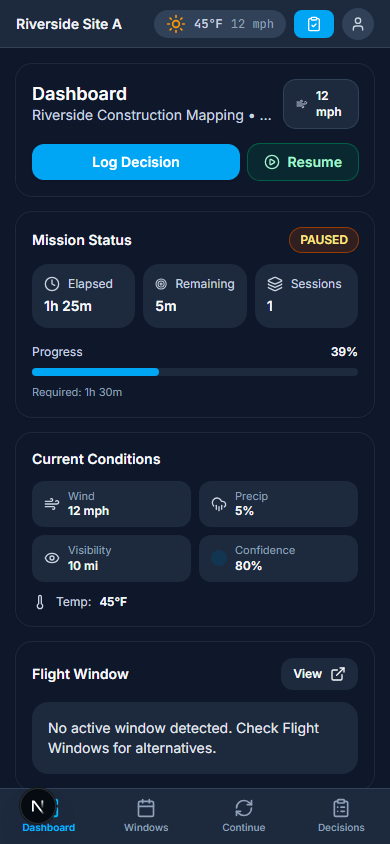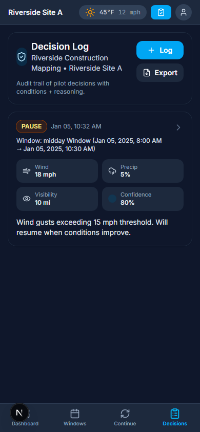 Plan flight windows, pause and resume missions with confidence, and keep a defensible decision log. Advisory support that respects pilot authority.